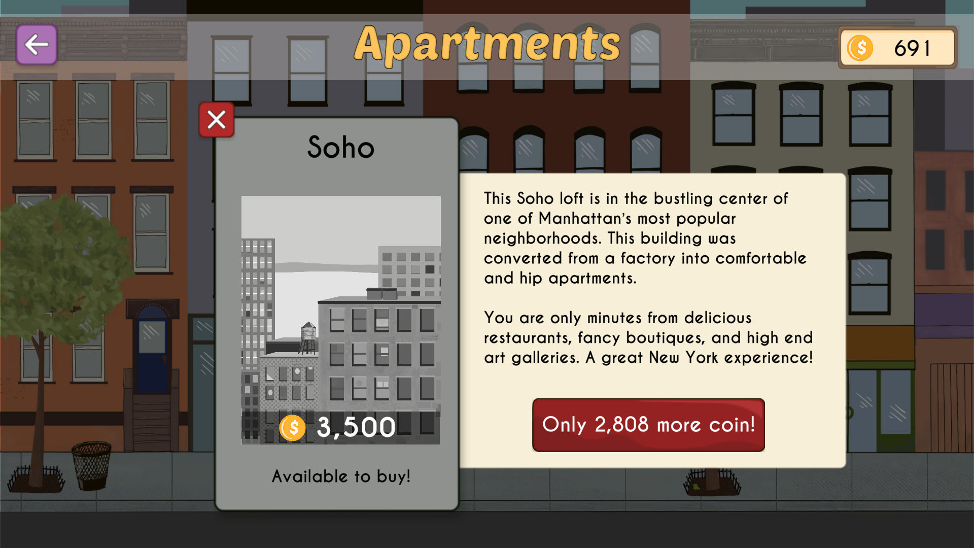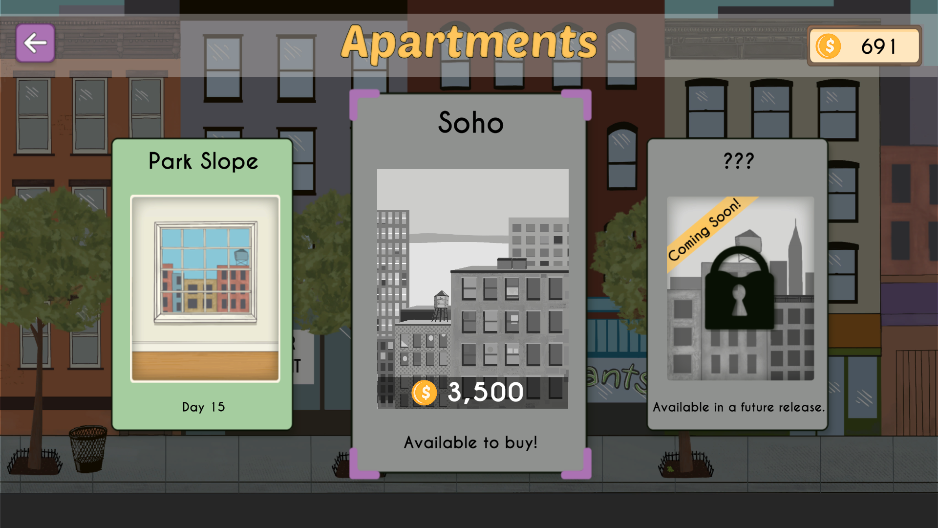 The apartment selection screen was introduced to allow players to easily switch between apartments. This layout provides a visual representation of each apartment, along with the number of days you have played on each one. Players were thrilled when this update was included, as they could visualize information about future content.