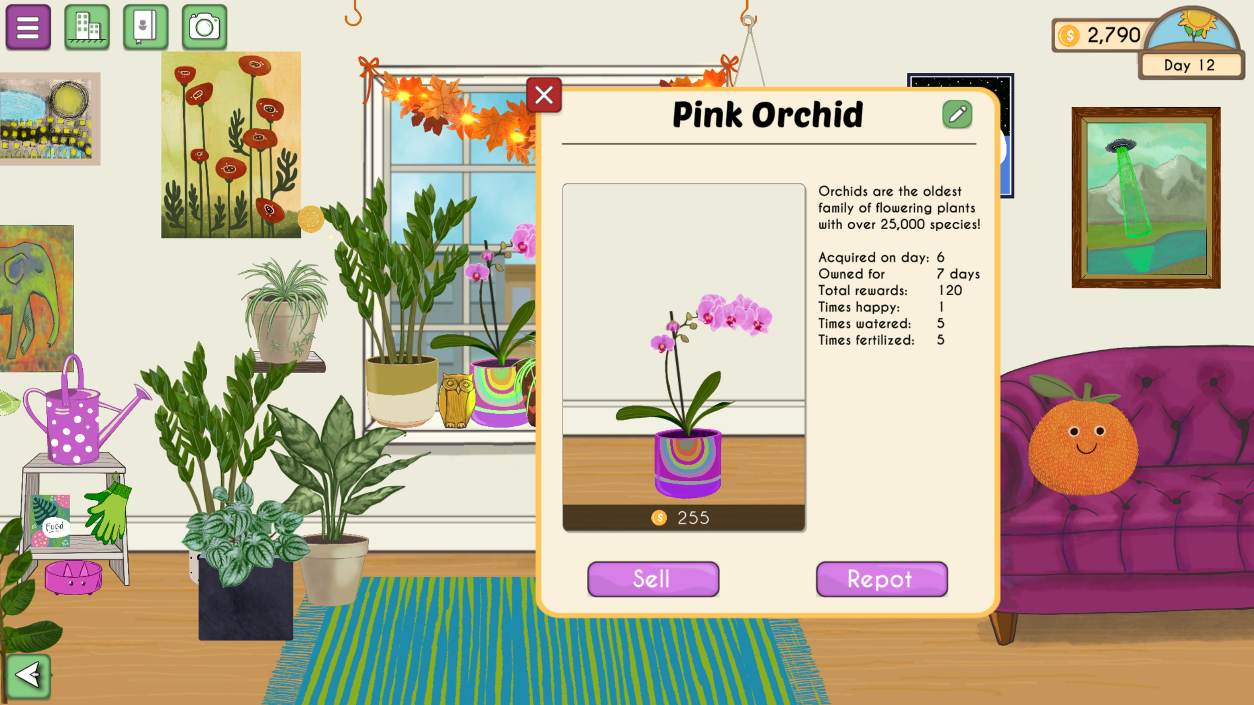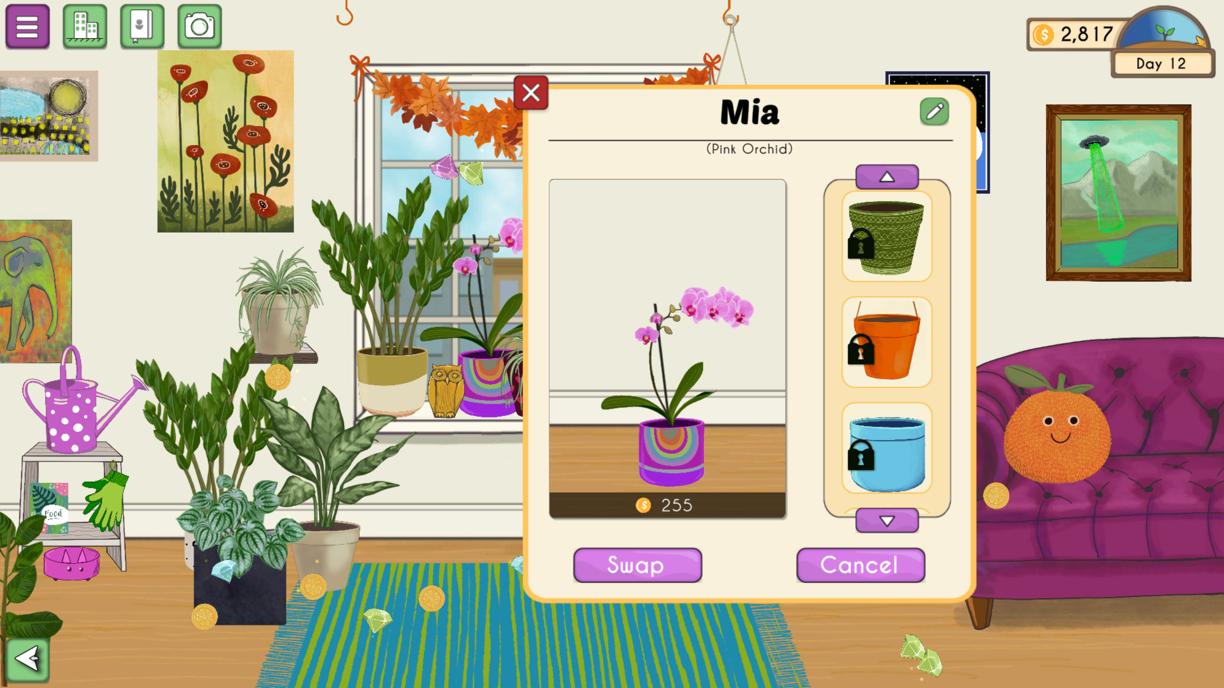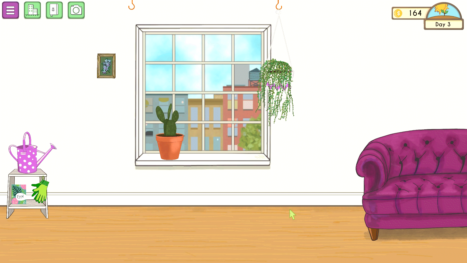 Plant Therapy features a cozy computer game in which players can decorate their New York City apartment with plants, art, and more. By watering, fertilizing, and growing plants from sprouts, players can earn coins and unlock achievements.
