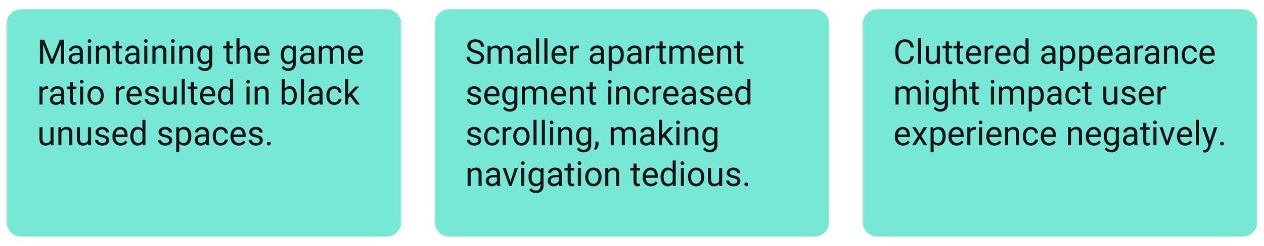 This solution reduces visual clutter while providing a decorative toolbar at the bottom that fills the unused space. It maintains symmetry but generates a square filling, as all the subgroups are clearly divided. However, when discussed with the team, they wanted to remove all icons and suggested that we include directional icons to navigate through the apartment more quickly (scrolling through the apartment was not working properly at this point, and we used directional icons in the PC version in the past).