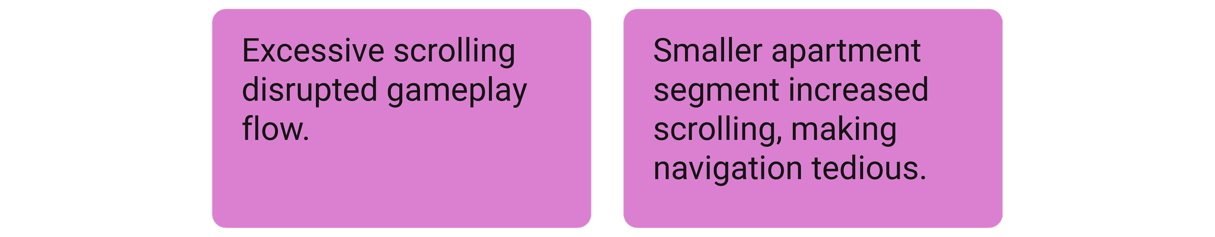 This solution reduced the subgroups and added the required directional icons. The team liked the balance and symmetry but was unsure about moving the game clock to the bottom since the decorative clock, which can be purchased through one of the DLCs, wouldn’t work in this version. At this point, the programmer had refined the scrolling, and we concluded that we should add information about scrolling during the game’s onboarding process and remove the directional icons.